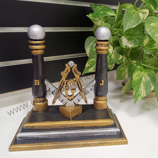 As colunas, acompanhadas do símbolo do esquadro e compasso, representam força, estabilidade e equilíbrio, integrando o significado arquitetônico das colunas à retidão e harmonia entre razão e espírito simbolizadas pelo esquadro e compasso.